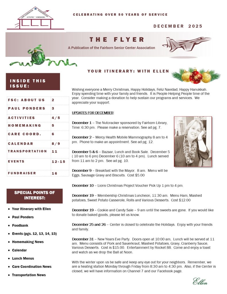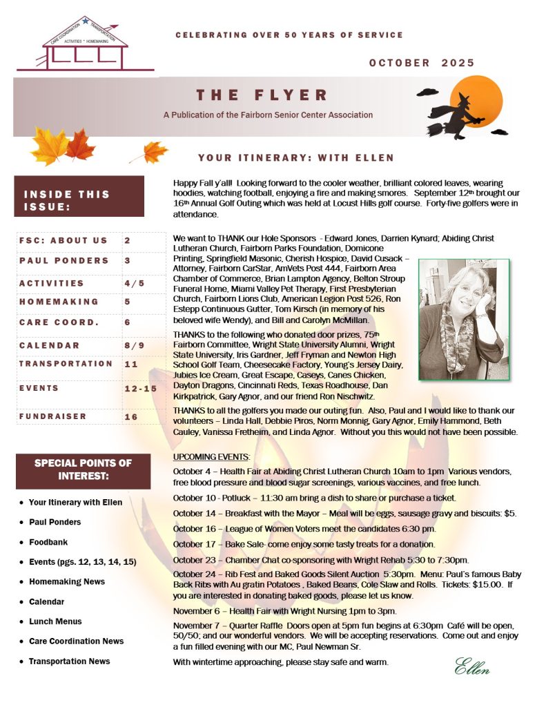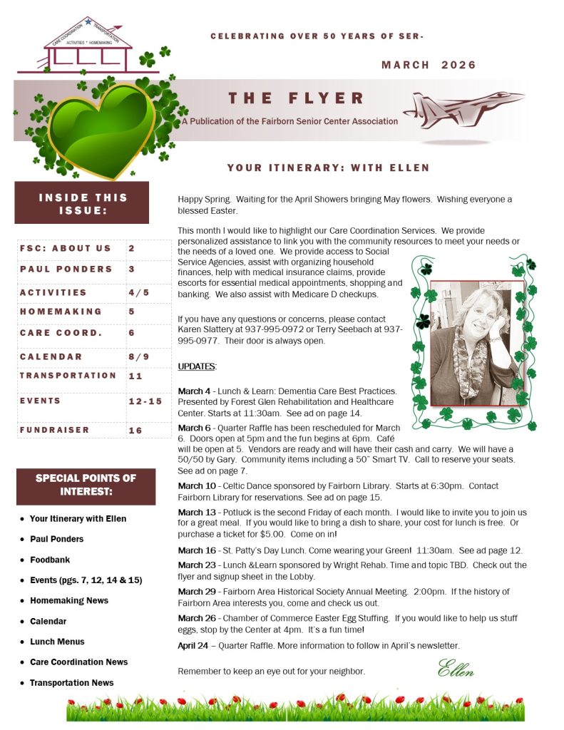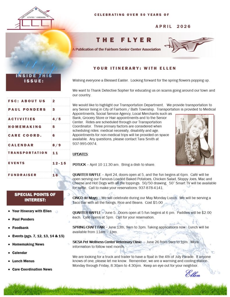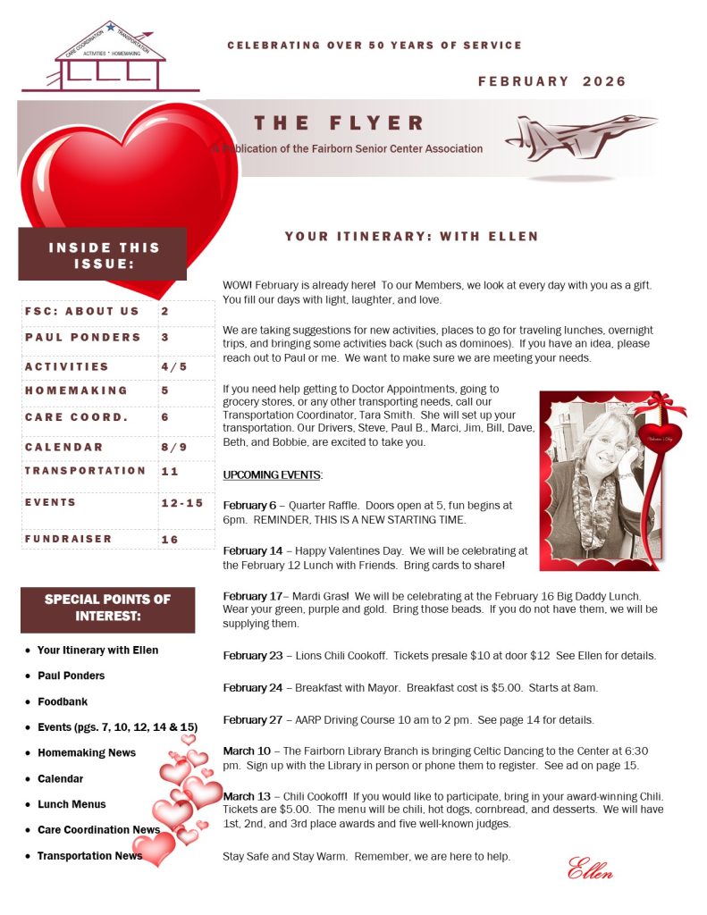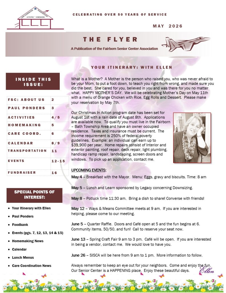 The Fairborn Senior Citizens Association mission is to provide a multipurpose senior center from which services and activities are provided on-site or by referral to meet the needs of senior citizens in Fairborn and Bath Township Area. We are a nonprofit social service organization governed by a local volunteer board of trustees, incorporated with State of Ohio, and designated as a 501 C3 organization with the IRS. We are contracted with the Area Agency on Aging to provide Outreach and Transportation Services and contracted with Greene County Council on Aging for Homemaker Services. We receive grants from United Way of Greater Dayton, Greene County Council on Aging, City of Fairborn, and Bath Township to provide Senior Center, Outreach, Transportation and Homemaker Services.